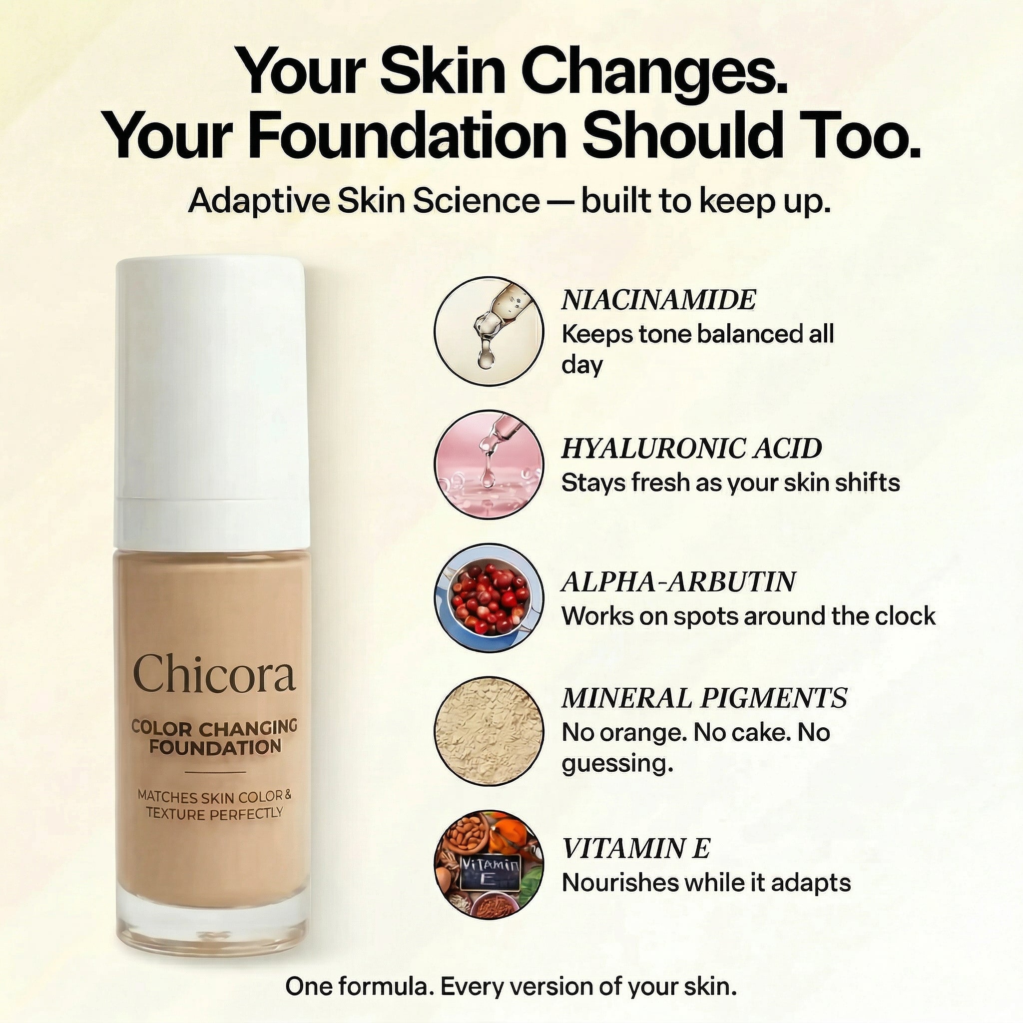 Other color-changing foundations failed you. Ours is different - formulated with carefully selected, research-backed ingredients for real results.